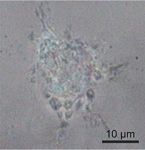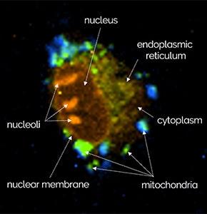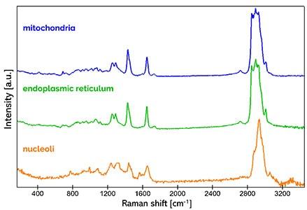 Since confocal Raman imaging is a non-destructive microscopy technique, it is well suited for studying living cells in their physiological surroundings without damaging them. In this example, epithelial rat cells were investigated. Typical Raman spectra were found for mitochondria (blue), endoplasmic reticulum (green) and nucleoli (orange). The color-coded Raman image visualizes the location of these organelles in the cell.