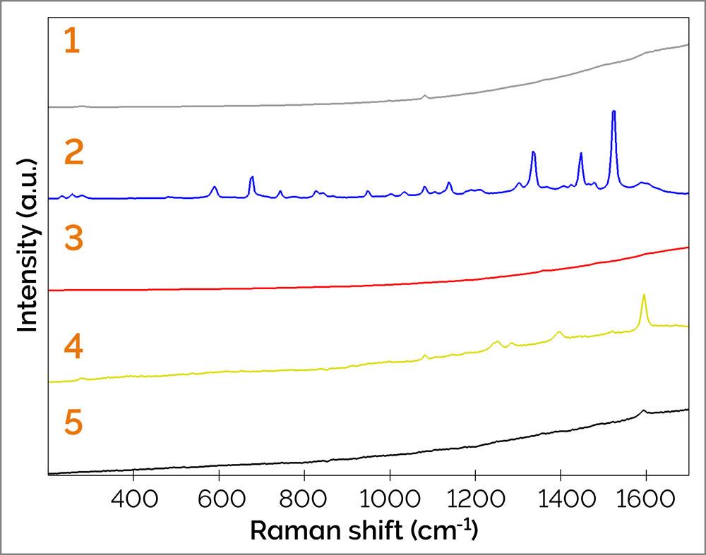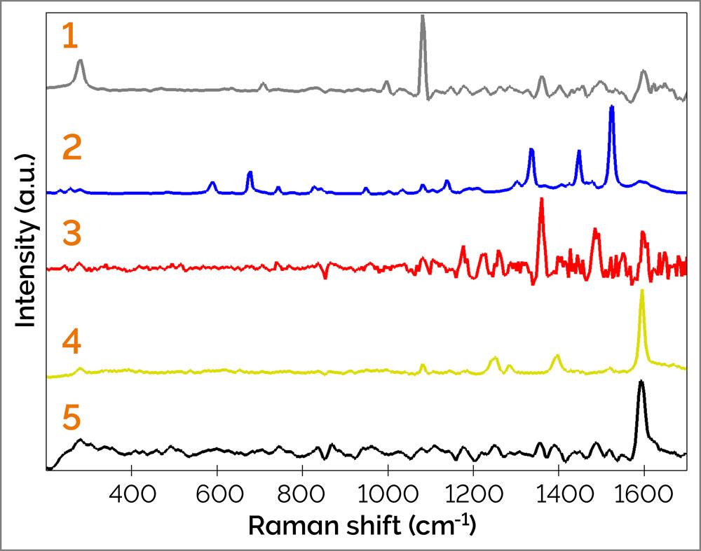 For illustration, the Raman probe was positioned in front of a framed poster showing a portrait of Sir C. V. Raman. Using the alphaCART’s white-light illumination and video camera, a part of the poster was magnified, showing differently colored ink spots. The raw Raman data recorded at different positions with a 532 nm laser was partially obscured by the high fluorescence background from the paint. However, applying efficient background subtraction algorithms revealed the Raman spectra of the various pigments and of the coated paper. Due to the system’s high confocality, the protective glass in front of the poster remained outside of the focal plane of the measurement, reducing the fluorescence background and enabling the detection of the Raman signals.